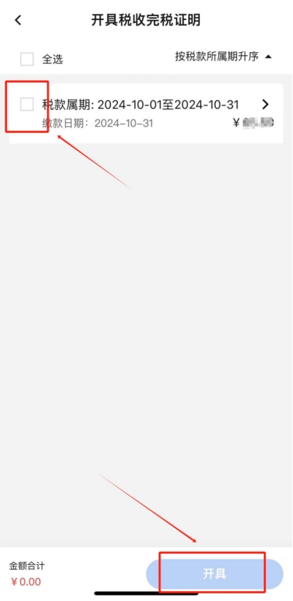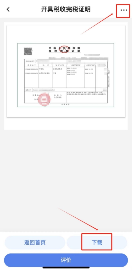 在查詢結果中勾選本次繳納的單筆稅款,點擊“開具”,即可查看并下載完稅證明(如有需要,您可點擊完稅證明預覽頁面右上角“...”將發票分享至對方)。