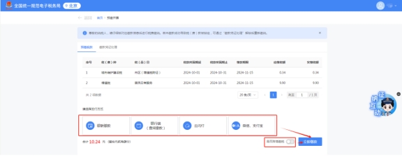 進入繳稅頁面后,可以看見需要繳納的稅款明細及支付方式,目前支付方式包含銀聯繳費、銀行端(查詢繳款)、云閃付、微信、支付寶等方式。也可以跨境繳稅。選擇完方式后,點擊立即繳款。