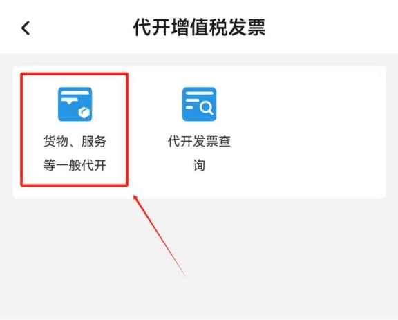 點擊“貨物、服務等一般代開”(目前移動端APP尚不支持房屋出租發票代開,如有需要您可通過電腦端線上辦理,具體操作步驟請查看個人代開房屋發票,新電子稅局的操作流程來啦!)。