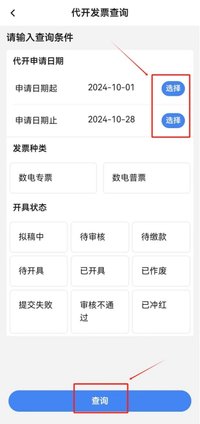點擊首頁“代開增值稅發票”,點擊“代開發票信息查詢”,選擇提交申請的起止日期,點擊頁面下方的“查詢”。