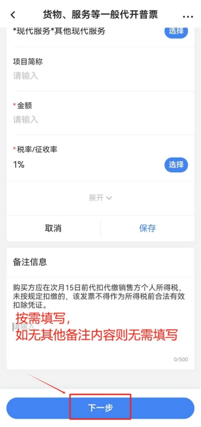 點擊“項目信息”一欄中的“添加項目信息”,“項目編號名稱”選擇“*現代服務*其他現代服務”,“項目簡稱”按需據實填寫(例如:勞務費/講課費等),“金額”據實填寫開票金額,“稅率/征收率”選擇“1%”,點擊“展開”可填寫更多信息,可根據開票需求自行選擇填寫(非必填項),填寫完成后點擊“保存”。