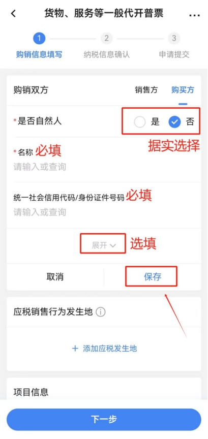 點擊“購銷雙方”一欄中的“銷售方”,核驗個人身份信息是否正確(銷售方僅能為登錄APP的用戶本人),無誤后點擊“購買方”,點擊“添加購買方”,根據實際情況選擇“是否為自然人”并填寫“名稱”及“統一社會信用代碼/身份證件號碼”(點擊“展開”可填寫更多信息,可根據開票需求自行選擇填寫,非必填項),填寫完成后點擊“保存”。