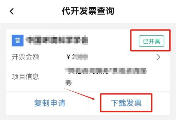 再次點擊首頁“代開增值稅發票”,點擊“代開發票信息查詢”,選擇提交申請的起止日期,點擊頁面下方的“查詢”。在查詢結果中找到本次提交的申請,該條申請右上角狀態為“待開具”,點擊“開具發票”,右上角狀態變為“已開具”,點擊“下載發票”,即可查看并下載該發票(您可點擊發票預覽頁面右上角“...”將發票分享至對方)。