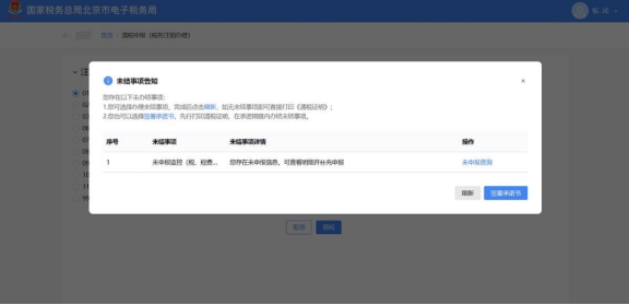符合即辦注銷資格及條件,但存在未辦結事項,且未辦結事項存在非提示類事項時,系統提示:您存在以下未辦結事項。