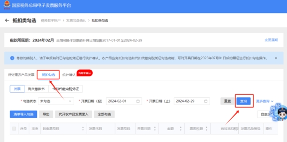 答、您好,請您通過新版登錄模塊登錄電子稅務局后點擊【我要辦稅】—【稅務數字賬戶】—【發票勾選確認】,進入【抵扣類勾選】模塊;在“抵扣勾選”標簽頁,選擇查詢條件后點擊【查詢】,查到數據后在最左側勾選框內勾選本次需要認證的發票(也可以點擊全部勾選),點擊【提交勾選】;提交勾選成功后,進入抵扣勾選菜單右側【統計確認】標簽頁,如果當前稅款屬期還統計確認,可點擊“申請統計”按鈕進行統計。申請統計提交后系統將對納稅人勾選結果進行實時統計。(若申請統計按鈕是藍色的,則代表尚未生成申請統計,需要先點擊按鈕進行統計),核對統計數據無誤后,需對統計表進行確認,點擊【統計確認】按鈕,出現確認統計彈窗,點擊【繼續】后確認統計成功,下方按鈕變為【撤銷確認】(所屬期內撤銷后可繼續認證發票并申請統計確認)。