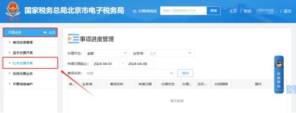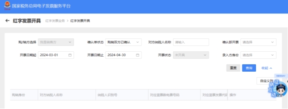 四、錄入查詢條件查詢到此前開具的紅字信息確認單,點擊右側的“去開票”,進入紅字發(fā)票開具頁面,之后正常開具紅字發(fā)票即可。