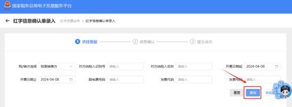 四、錄入查詢條件,點擊【查詢】按鈕,查詢需要紅沖的藍字發(fā)票信息。在查詢結果中點擊“選擇”后進入【錄入紅字信息確認單頁面】,在該頁面中若數(shù)電票票種選擇的是“電子發(fā)票”,點擊【提交】按鈕,提示:“尊敬的納稅人,您選擇紅字發(fā)票票種是“電子發(fā)票”,確認方確認后系統(tǒng)將直接生成紅字發(fā)票,請確認是否繼續(xù)提交?”,點擊【確定】,紅字發(fā)票開具成功;若數(shù)電票票種選擇的是“與原藍票一致票種的紙質發(fā)票”,點擊【確定】,跳轉到“提交成功”界面,提示紅字信息確認單提交成功。