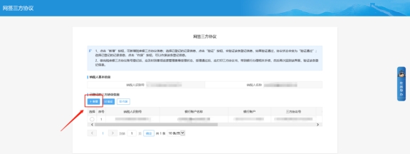 四、選擇銀行信息點擊確認(rèn)分別根據(jù)需要選擇或填寫清算行行號、批扣標(biāo)志、辦理人員身份證件號碼然后點擊下一步,再返回網(wǎng)簽三方協(xié)議界面。選擇新增的信息點擊驗證,協(xié)議狀態(tài)變?yōu)轵炞C通過說明三方協(xié)議簽定成功。