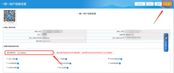三、一照一碼戶登記信息變更頁面,在查詢變更項(xiàng)目后點(diǎn)擊下拉菜單,選擇生產(chǎn)經(jīng)營地址,將變更后內(nèi)容填寫完畢后點(diǎn)擊下一步提交即可。