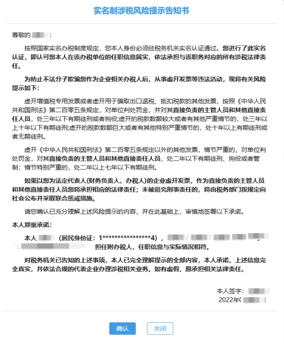 七、實名制涉稅風險提示告知書頁面。
