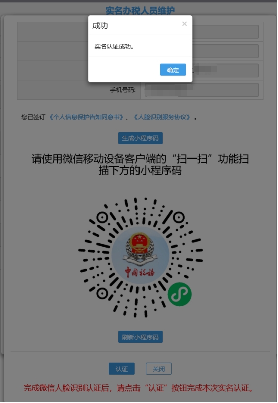 十、人臉識別頁面(掃描二維碼)完成后點擊“認證”。