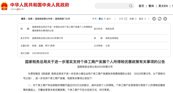 《國(guó)家稅務(wù)總局關(guān)于進(jìn)一步落實(shí)支持個(gè)體工商戶發(fā)展個(gè)人所得稅優(yōu)惠政策有關(guān)事項(xiàng)的公告》(國(guó)家稅務(wù)總局公告2023年第12號(hào))